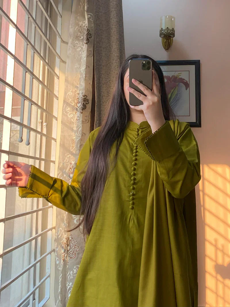 - Shirt – Tailored from premium Plain Khaddar, the shirt features a round neckline, beautifully highlighted with button detailing for a subtle, stylish touch. The daman has a slightly rounded cut, adding flow to the silhouette. Sleeves feature a front cuff design with a small cut, finished with delicate lace, blending tradition with modern flair.