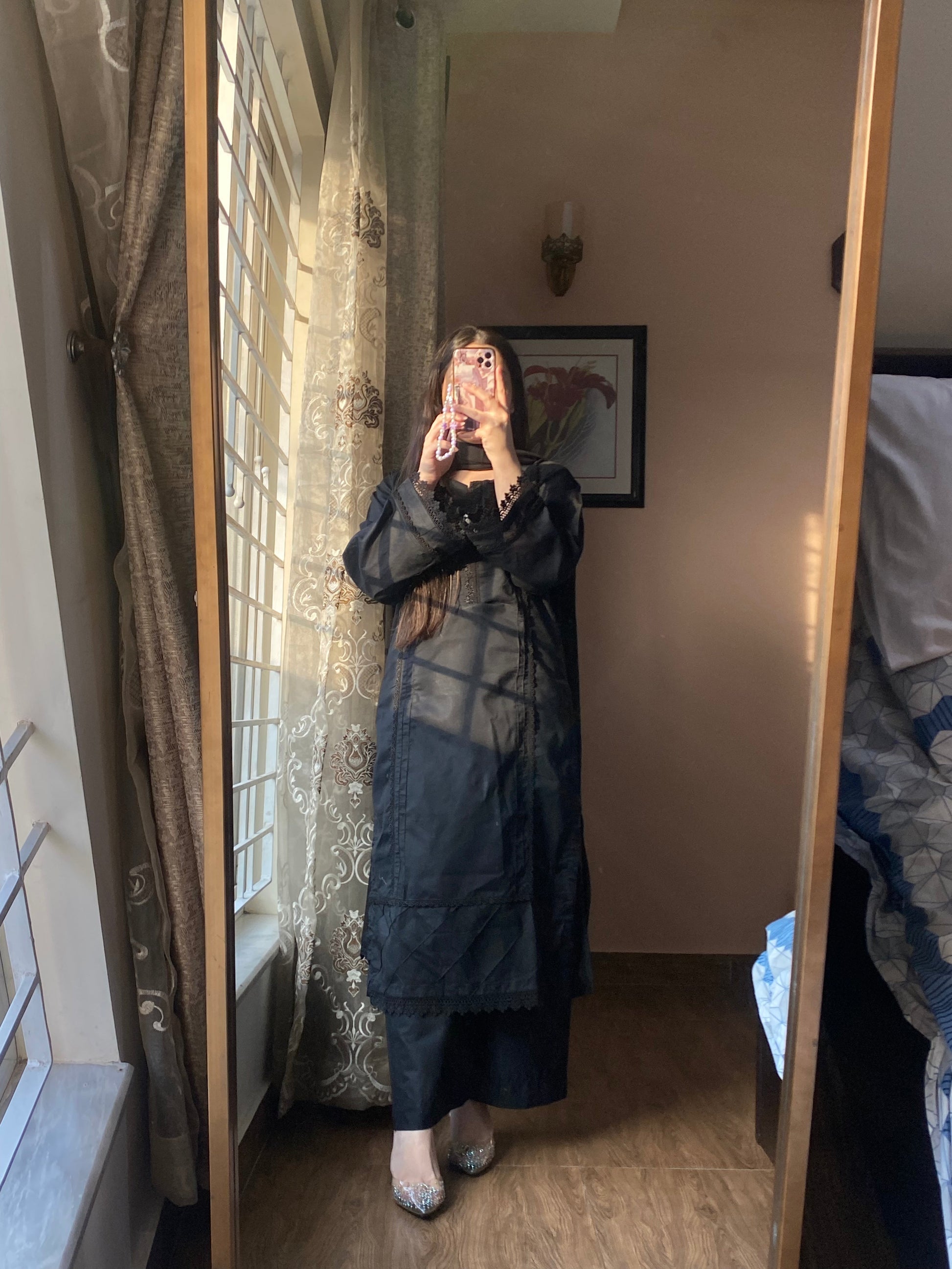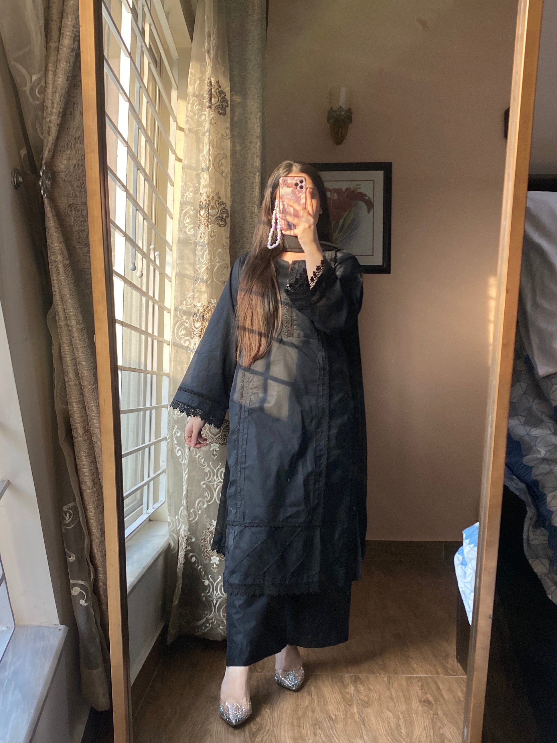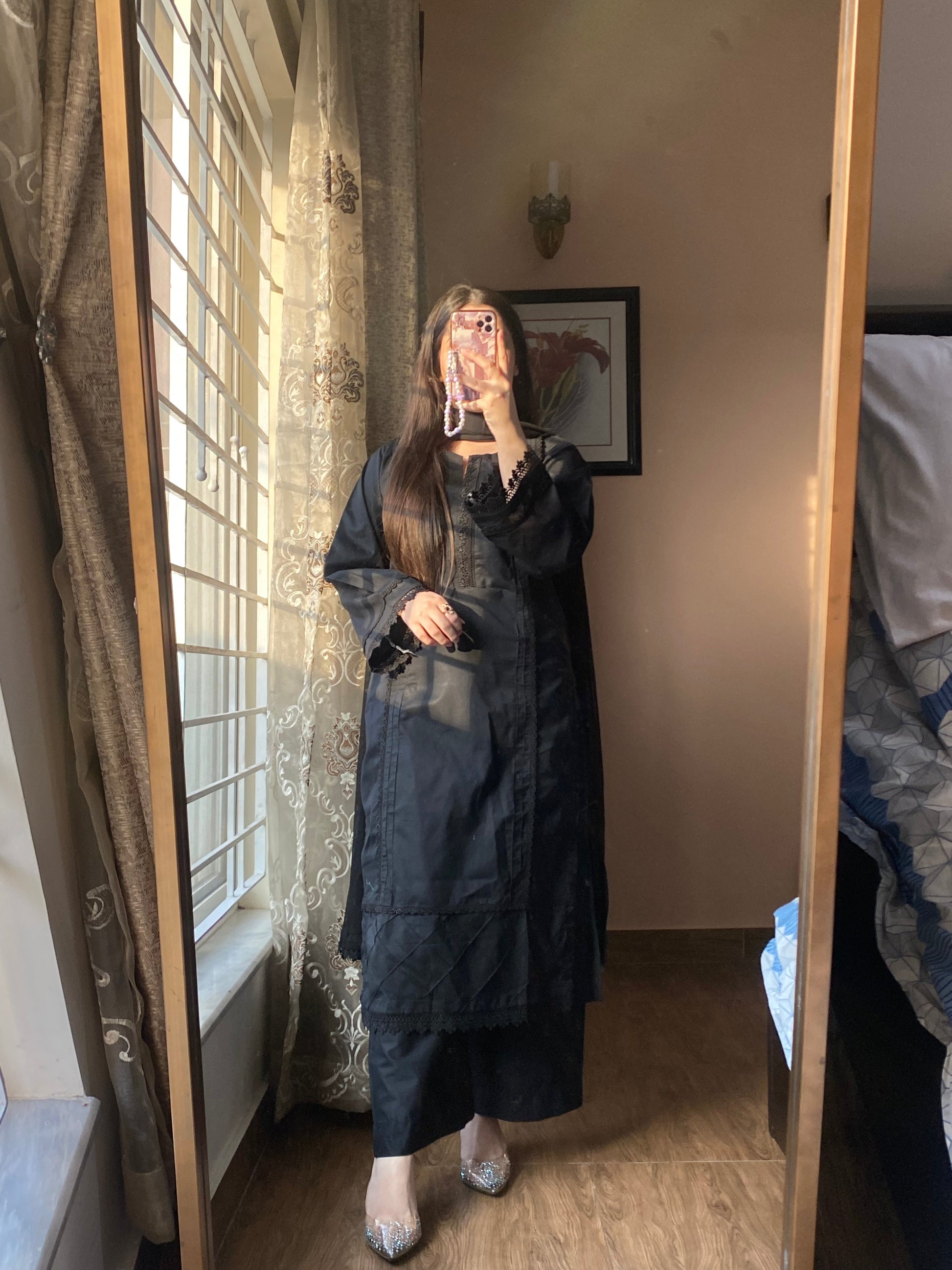 - Dupatta: Lightweight chiffon dupatta with lacework.