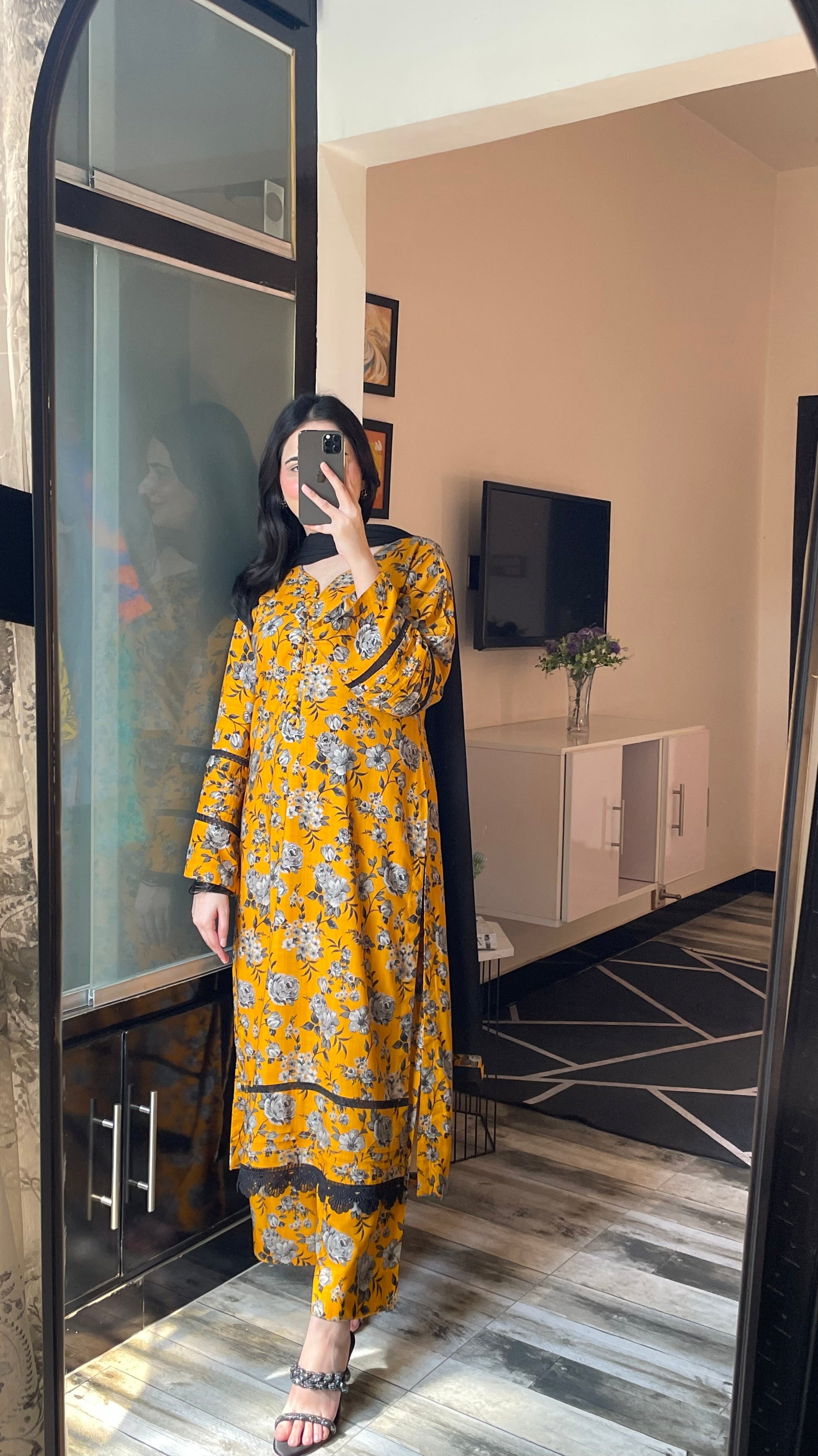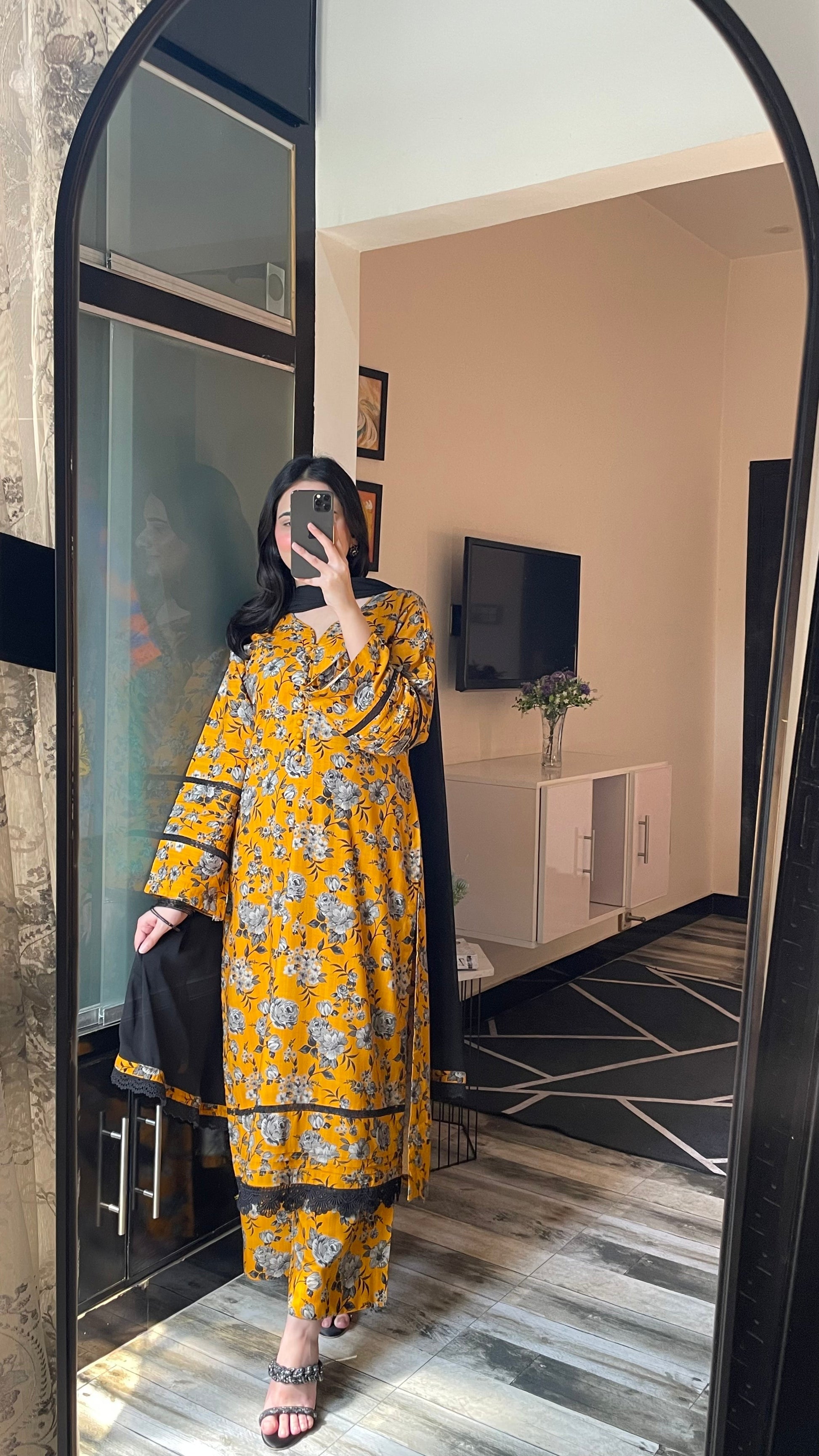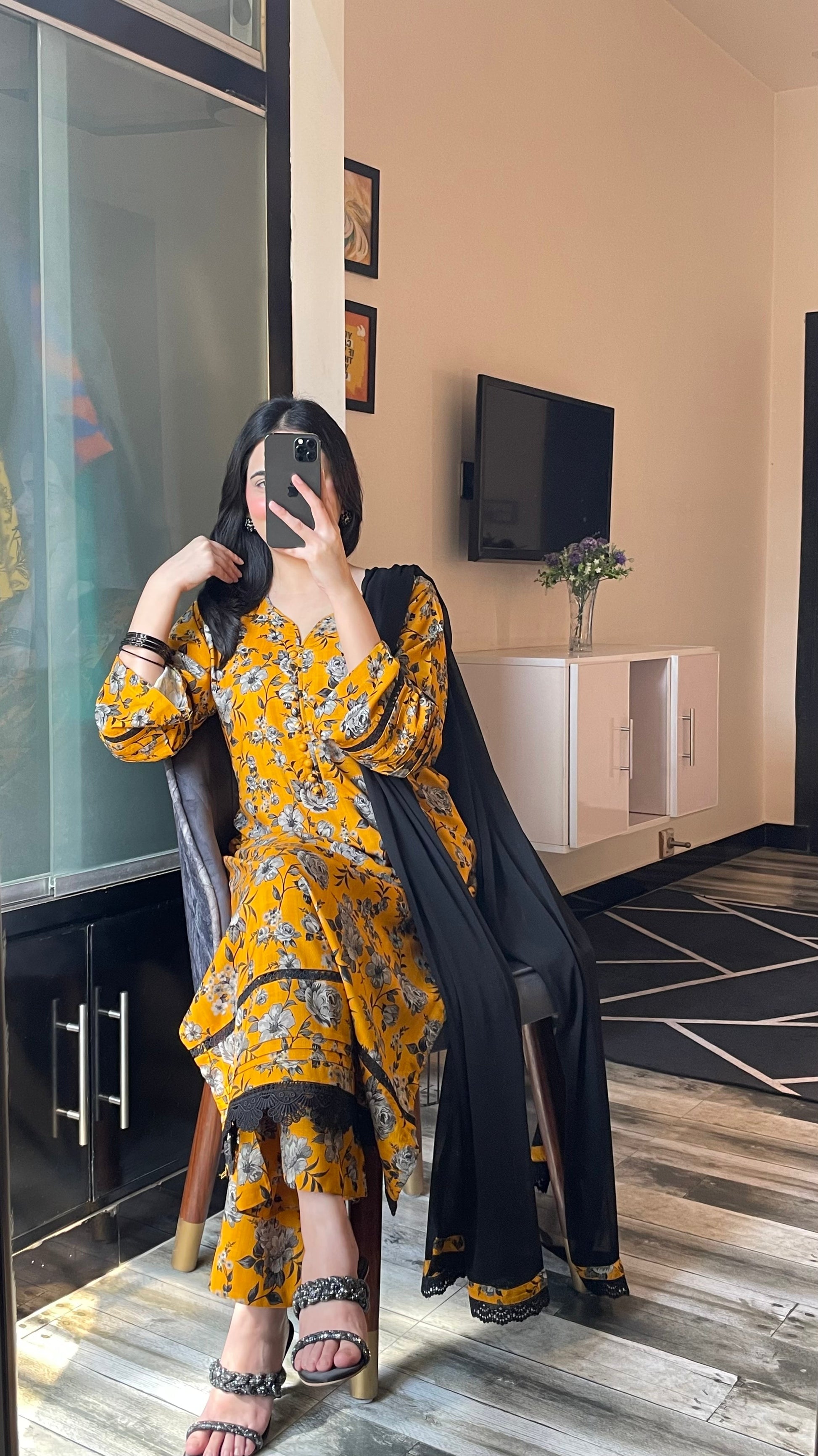 Dupatta:A beautifully finished chiffon dupatta adorned with lace work, adding a soft, feminine touch to the ensemble.